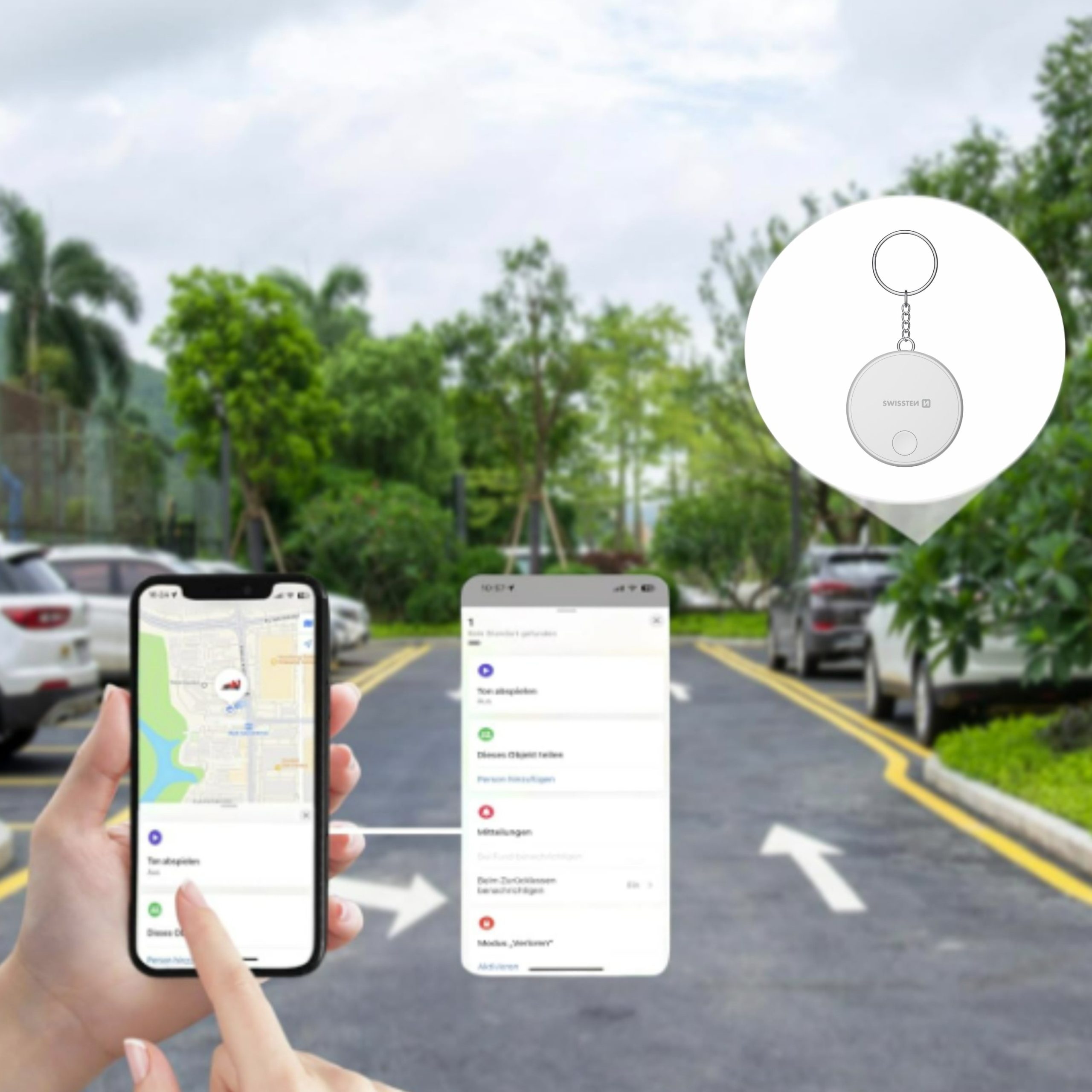 SWISSTEN Find Tag is a compact smart tracker that helps you easily locate lost keys, wallets, bags, or other valuables.